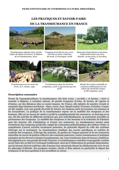 Forme de l’agropastoralisme, la transhumance(du latin trans, «au-delà», et humus, «terre»)consiste à déplacer, à certainessaisons, de grands troupeaux d’ovins, de bovins, de caprins et d’équins, sur des distances plus ou moins longues. En France, elle subsiste de manière vivante et organisée dans plusieurs territoires: Alpes, Corse, Jura, Massif central, Provence, Pyrénées,Vosges, où elle modèle, avec une grande diversité de formes, les relations entre les hommes, les animaux et les écosystèmes. La pratique de la transhumance repose sur la mobilité des troupeaux et des hommes. Elle est un moyen de mettre à profit la complémentarité des ressources, en fourrage et en eau, été des activités de différents territoires qui, pris individuellement, ne pourraient accueillir en permanence des troupeaux. La mobilité des troupeaux et des hommes et la recherche de fraîcheur sont des facteurs clés d’adaptation et d’accès aux ressources. La transhumance permet ainsi d’entretenir des troupeaux productifs, malgré les contraintes pédoclimatiques des milieux visités, et complément d’autres activités localement présentes. Sa pérennité dépend de celle des systèmes d’élevage qui la pratiquent. La transhumance implique des savoirs spécifiques en matière de conduite des troupeaux, d’élevage des animaux, de gestion de l’espace pastoral et de ses ressources naturelles ou encore de gestion collective des communs pastoraux, toutes connaissances et pratiques partagées par les éleveurs et bergers transhumants, qui, pour transhumer dans de bonnes conditions, interagissent avec une grande diversité d’acteurs. La transhumance contribue à sauvegarder certains savoir-faire liés au bâti et à l’artisanat traditionnel, ainsi qu’à l’élaboration de produits alimentaires, que les bergers doivent maîtriser afin d’assurer leur autonomie durant les déplacements et la vie sur les pâturages d’altitude. Des pratiques sociales, rituels et fêtes saluent en particulier le départ des troupeaux et de leurs gardiens et les accueillent au retour.