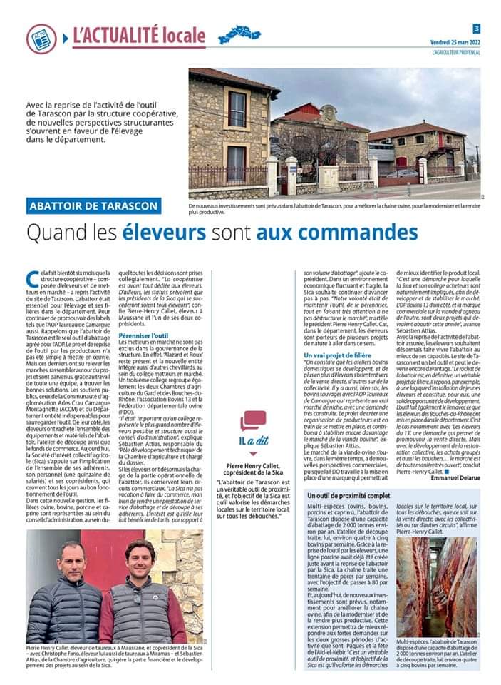Article de Presse sur la reprise de l’abattoir de Tarascon par les éleveurs.